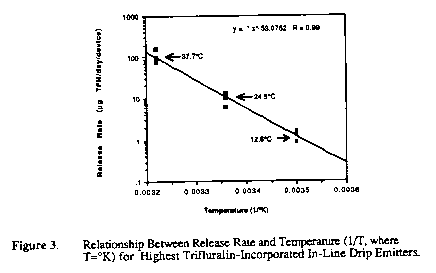The in vitro performance evaluations of the three trifluralin-incorporated "In-Line Drip Emitter" configurations exhibit the expected temperature release rate responses characteristic of these sustained release delivery systems. The SELs of the medium and high percent concentration devices were determined to be 39 and 44 years at 130C, and 4.8 and 6.6 years at 250C. These are considered conservative estimates for these temperatures. The MELs based on soil/emitter diffusion gradients and lower seasonal temperature excursions will be longer, but we recommend not using the 2.4 correction factor pending further studies. The lowest percent trifluralin containing device does not perform in a reliable fashion and should not be considered