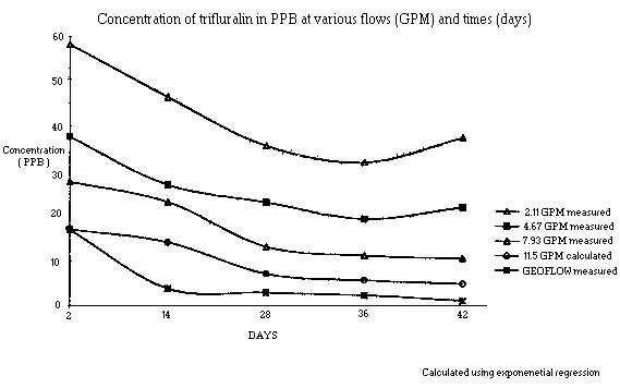 Results of the column studies are provided in Figures 1 through 4. Experimental studies have shown that the soil concentration of TFN required for weed control range from 0.5 to 2.0 ppm. This prevents the growth and elongation of roots into the emitter or prevents weed seedlings from establishing within the treated zone. The relative zones of efficacy and regulatory limits are crop dependent, and range from 0.5 to 2.0 lbs/acre