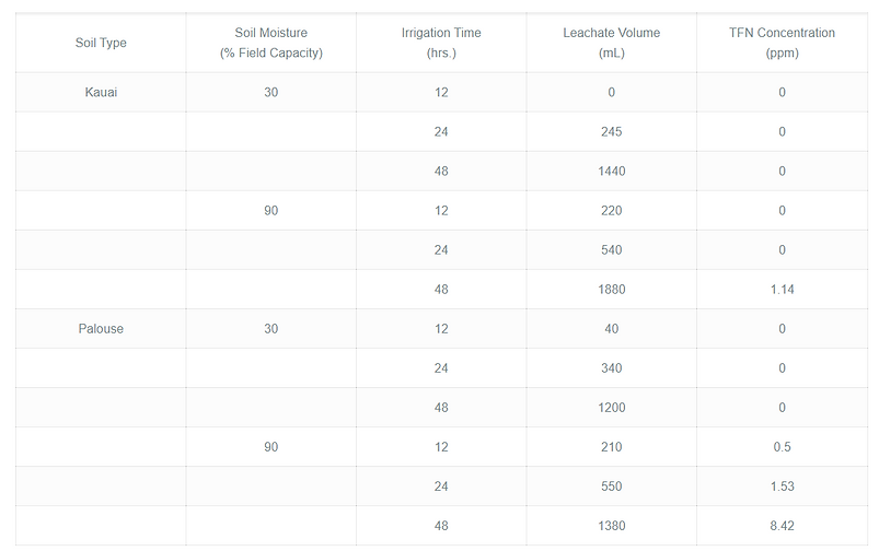 Table 2. Column leachate volumes, and TFN concentrations in leachates based on soil type and irrigation regime.