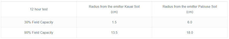Fig. 5 demonstrates and Table 1 summarizes the comparative efficacy of applying TFN via buried drip irrigation water for 12 hrs. to either moist or saturated soils. It is clear that the zone of efficacy in moist, but not water saturated soils, is limited with TFN concentrations of 2 ppm being attained over radii of 1.5 to 6 cm from the emitter. For previously water saturated soils, the protective radii increase to from 13.5 to 18 cm from individual emitters.
